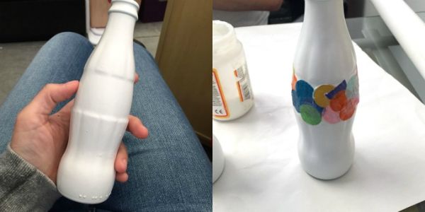 Logo após a tinta estar totalmente seca, aplique um pouco de cola para decoupage em uma parte da sua garrafa de vidro na parte que você quiser. Depois posicione sobre a cola para decoupage alguns confetes grandes ou alguns círculos de papel cortados por você aplique mais cola para decoupage sobre estes círculos.
