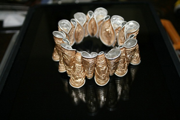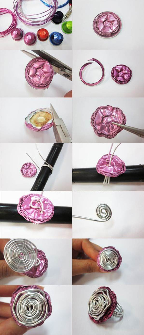 Amasse uma cápsula de café e corte a borda. Enrole um arame em uma caneta, fazendo várias voltas e passe as pontas, do arame pelo meio da cápsula. Enrole uma das pontas, meça o tamanho do seu dedo e enrole a outra ponta até prender. E está pronto! Se você quiser pode acrescentar também uma pedraria bem no meio do seu novo anel.