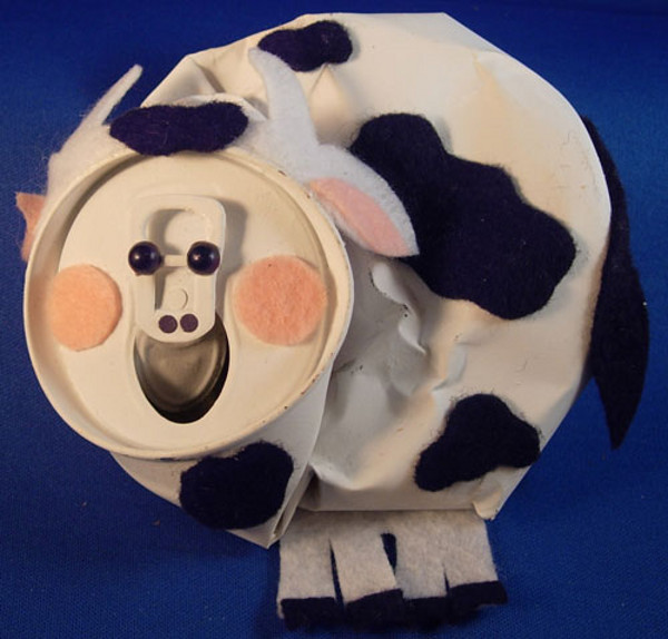 Ainda para as crianças você pode fazer uma vaquinha de latinha de refrigerante. Os detalhes podem ser feitos com feltro ou papel.