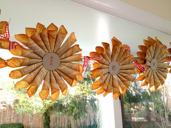 Com papel velho ou jornal você também decora a sua janela ou qualquer espaço fazendo um cordão de flores de papel.
