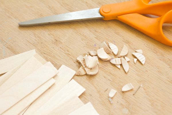 Comece separando todos os materiais que você vai utilizar em seu trabalho. Depois com o auxílio de um estilete ou de uma faca bem afiada, corte as pontas dos palitos para sorvete. E depois corte os palitos para sorvete em pedaços.