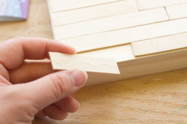 Em seguida, comece a colar os pedaços de palitos para sorvete sobre a tela e também nas laterais da sua tela escolhida.