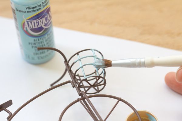 Logo após, forre o local onde você vai pintar a sua peça, com jornal velho, papel velho, papelão ou plástico. Depois pinte a sua bicicleta de arame com a cor que você quiser. E se você quiser uma cor mais forte e intensa, aplique duas ou até mesmo três camadas de tinta, porém sempre deixando a tinta secar muito bem entre uma camada e outra. E deixe a tinta secar muito bem antes de manusear novamente a sua peça e continuar com a confecção de seu trabalho.