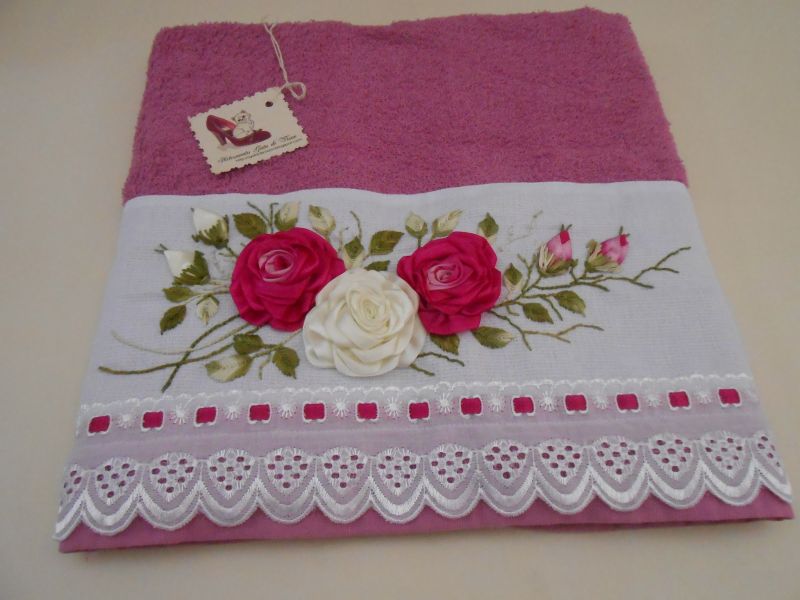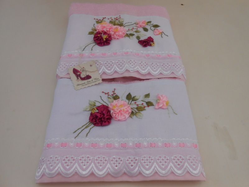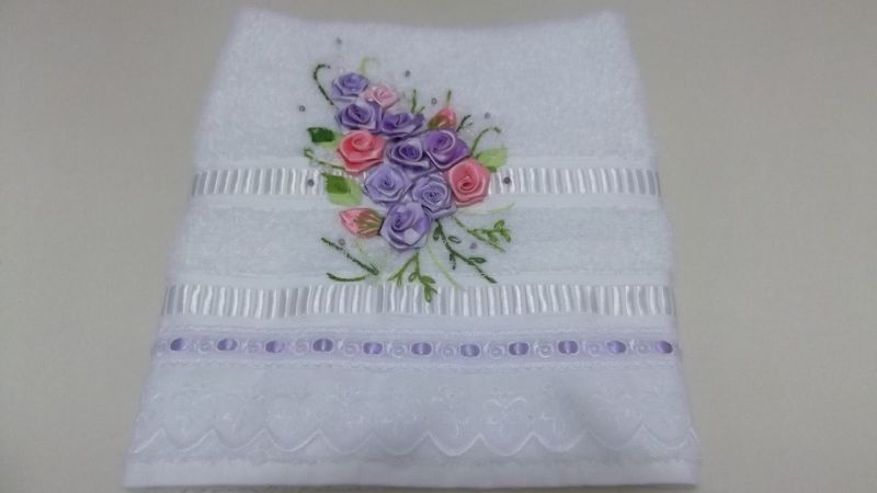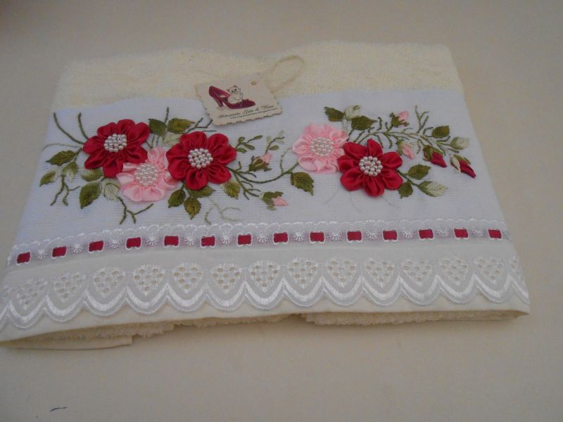 O bordado com fitas pode também sofrer variações. As fitas podem ser bordadas em uma toalha das mais diversas maneiras, até mesmo criando flores e folhas, para deixar a toalha ainda mais linda.