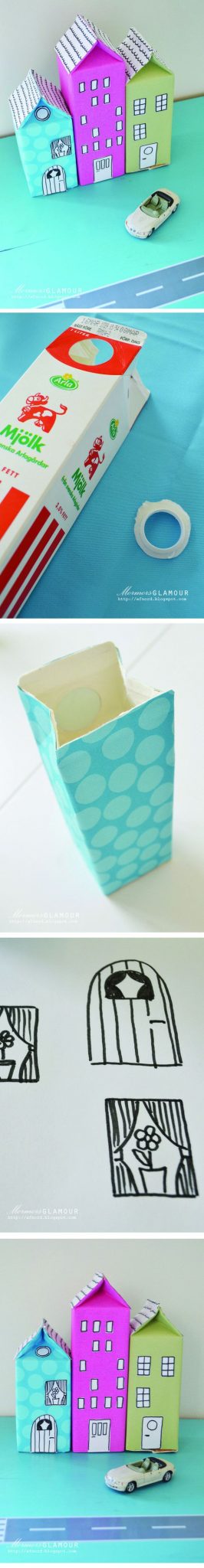 Encape caixinhas de leite fechadas, criando prédios, para a sua criança montar uma cidade e brincar muito.