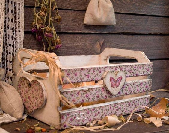 As delicadas de plantão podem pintar um caixote de madeira com tinta branca e fazer pátina e decoupage sobre o caixote, aplicando figuras românticas e femininas sobre a superfície do caixote.