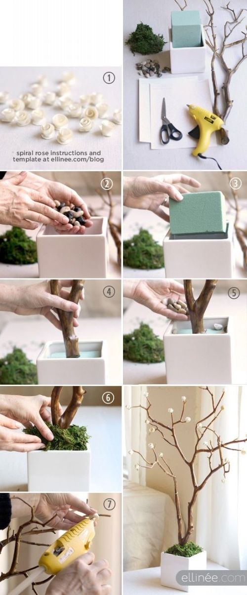 Por cima das pedras coloque o musgo. Para enfeitar o seu vasinho com galho seco, cole flores de papel ou cole outras flores artificias de sua preferência nos galhos. E está pronto!