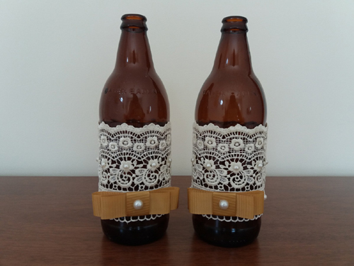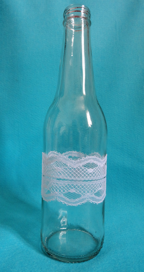 Outra versão simples de artesanato para garrafa de vidro com renda é a de acrescentar um entremeio ou bico de renda mais largo ao redor da garrafa, de forma centralizada.