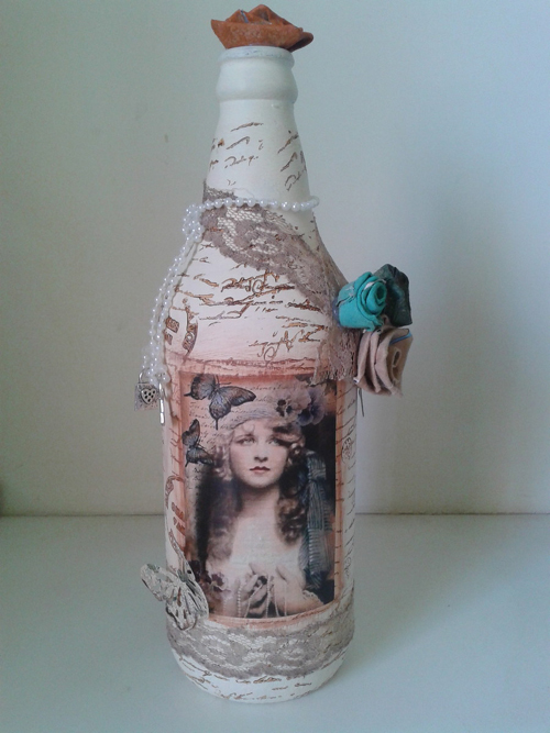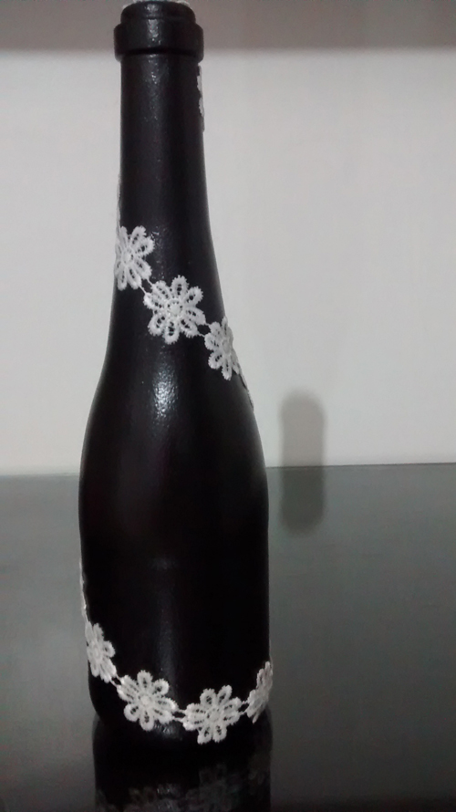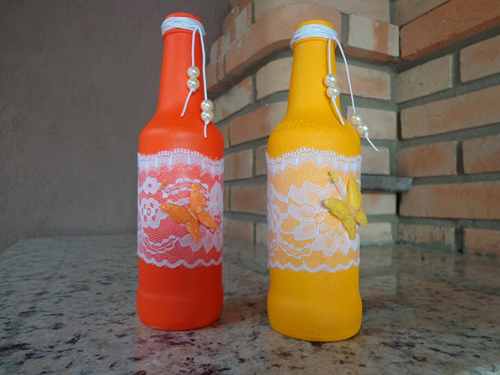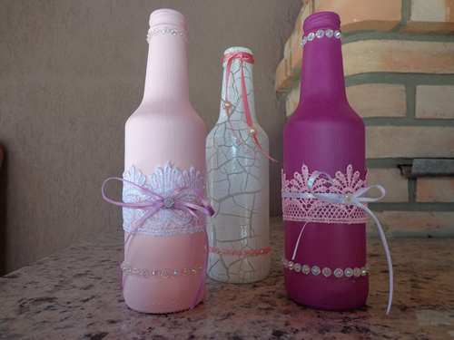 A garrafa em sua versão original, sem pintura ou sem outra técnica artesanal aplicada, pode receber um bico de renda pequeno ou flores de renda em sua extensão. Para colar estas partes, utilize cola quente, cola tudo, cola para decoupage ou uma cola resistente que você já trabalha normalmente. Você pode fazer movimentos sinuosos pela garrafa com o bico de renda estreito.