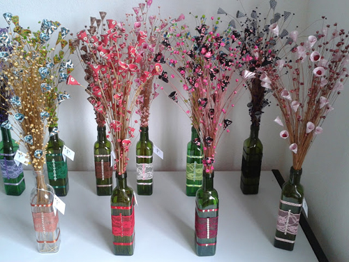 Artesanatos mais elaborados com garrafas e vidro e renda podem conter rendas mais sofisticadas e aplicadas sobre massa para construção, para criar textura; pode conter craquelados e pinturas diversas e pode conter um mix de outros elementos, além da garrafa e da renda.