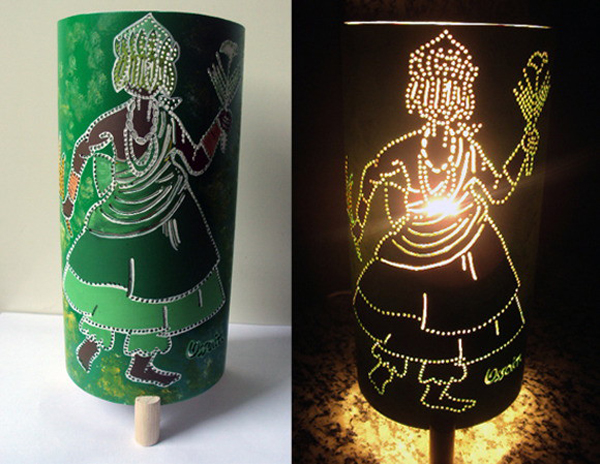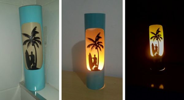 Outro modelo relativamente fácil de fazer luminária com cano de PVC é retirar uma parte do cano e neste espaço fixar um pedaço de papel-vegetal contendo silhueta colada de papel preto ou de papel contact preto.