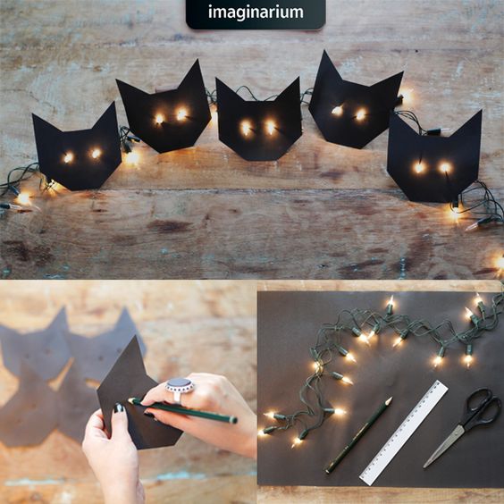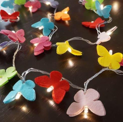Recorte formatos desejados, como borboletas e gatinhos e cole duas partes, mantendo a lâmpada do pisca-pisca no meio, com a ponta para fora. Ou faça dobradura com papel mais fino.