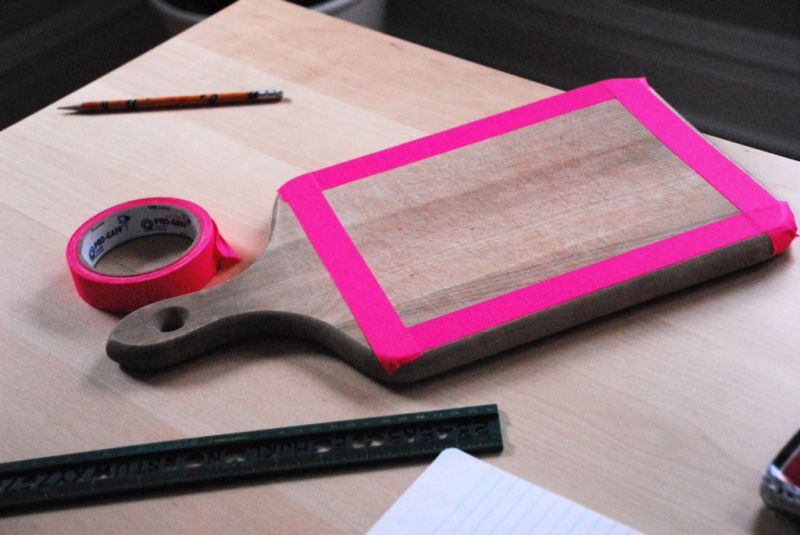 Comece separando todos os materiais que você vai utilizar em seu artesanato. Posicione a fita adesiva ao redor da tábua de carne, delimitando o espaço que você vai pintar.