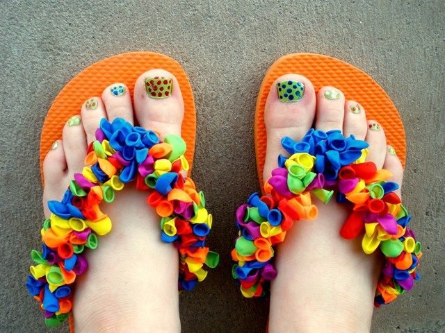 Além de poder fazer pulseiras multicoloridas com os balões, passando pedaços de balões por um fio de silicone ou elástico fino, você também pode decorar o seu chinelo com balões. Amarre os balões nas tiras do chinelo, fazendo nós. Esta customização de chinelo é fácil e rápida, mas ao final do trabalho o chinelo fica bem divertido e interessante.