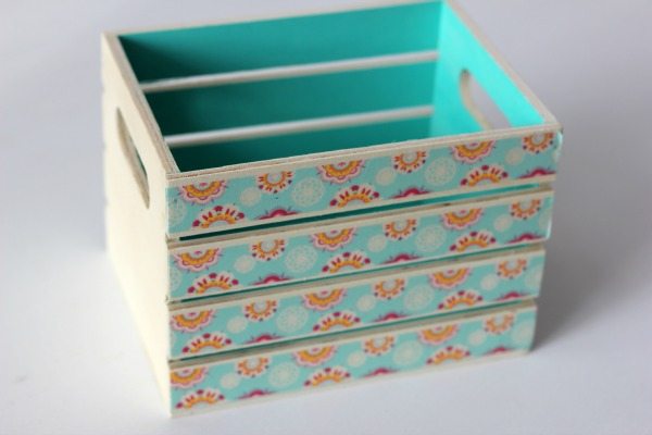 Você também pode aplicar papel em seu caixote de feira, em vez do tecido. E o procedimento de aplicação é o mesmo realizado com o tecido.