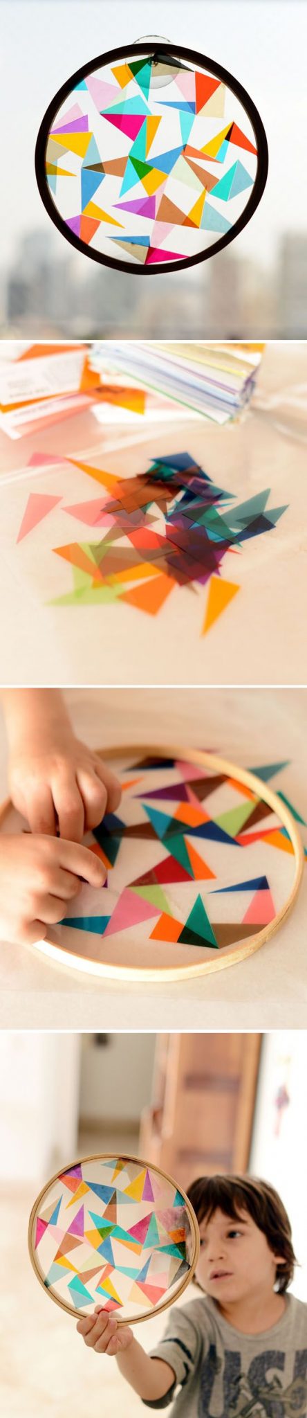 Comece separando todos os materiais que você vai utilizar em seu artesanato. Corte vários formatos nos papéis de seda coloridos. Risque no plástico transparente, no papel vegetal transparente ou no papel de seda transparente um círculo com o tamanho do aro. Cole o círculo de papel na parte detrás do aro com a cola quente. Cole os pedaços de papel colorido no plástico ou no papel. Quando terminar de decorar, amarre uma linha ou fixe a ventosa, para pendurar.