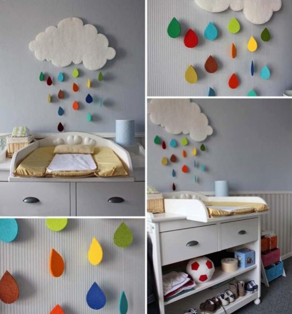 Comece separando todos os materiais que você vai utilizar em seu artesanato. Desenhe à mão, mesmo, uma nuvem no feltro branco ou na cor de feltro que você quiser. Recorte. Depois recorte gotas nos feltros coloridos. Você até pode usar retalhos de feltro. Fure a parte de baixo e a ponta de cada gota e a parte de baixo da nuvem, com um furador, se você possuir, ou com a ponta da tesoura. Amarre fios de nylon nas gotas, formando cordões e depois amarre na nuvem. E está pronto!