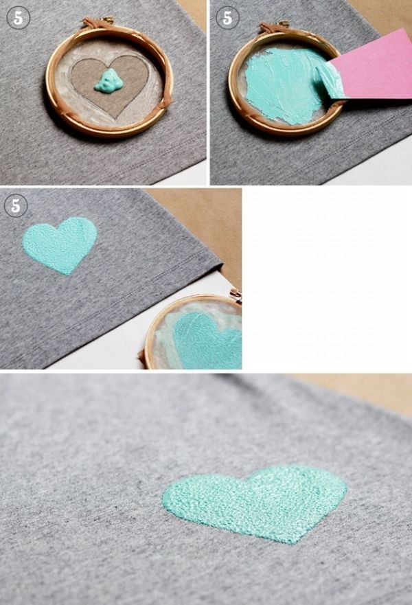 Prenda o pedaço da meia de seda no bastidor aplique bastante cola dos dois lados. Deixe secar. Desenhe o que você quiser, e depois corte o contorno. Posicione o bastidor sobre a camiseta e pinte. Deixe secar e está pronto!