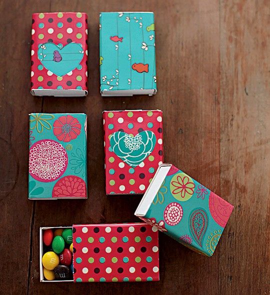 Faça lembrancinha para festas ou confraternizações encapado caixinhas de fósforos e colocando dentro balinhas ou outras guloseimas bem pequenas.