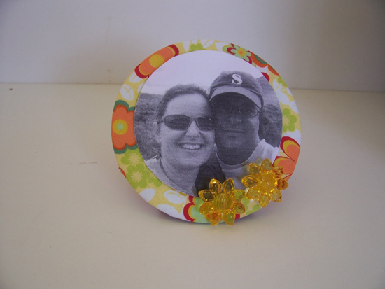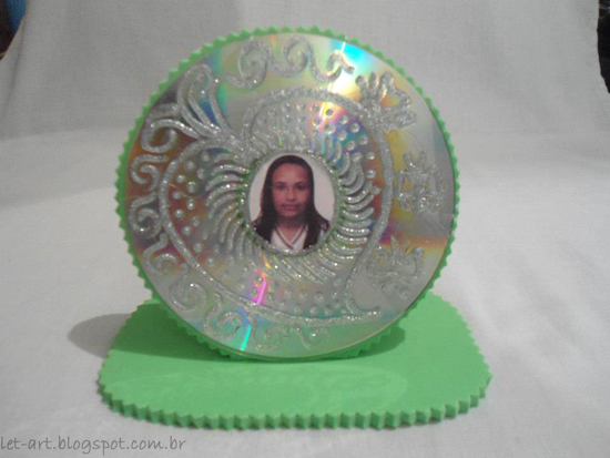 Corte um círculo de EVA com tamanho um pouco maior que o tamanho do CD. Picote ao redor. Corte a base de EVA. Picote ao redor. Corte a foto com o tamanho do meio do CD e cole-a no CD. Decore o CD como quiser e cole-o no círculo de EVA. Cole o círculo de EVA na base e cole atrás um suporte, que pode ter formato triangular, para manter o porta-retratos de pé.