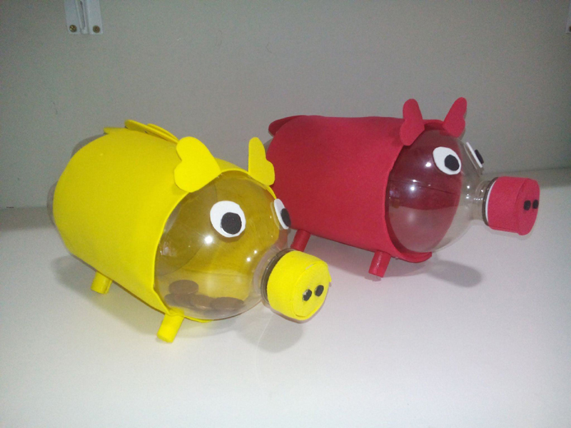 Outro fácil artesanato com garrafa pet e EVA é o cofrinho em formato de porquinho. Você pode usar a garrafa pet inteira para fazer este artesanato. Corte a parte do meio, para colocar as moedas.
