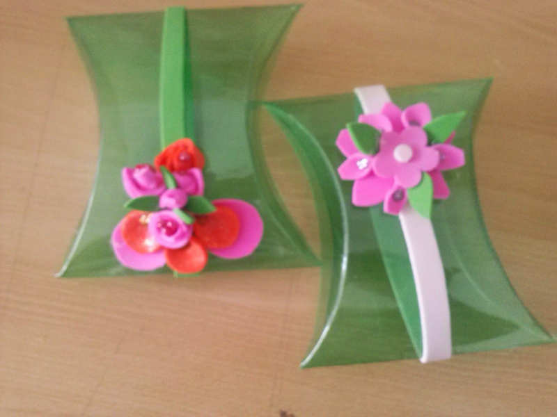 Corte a parte reta da garrafa pet, dobre, de forma a criar a embalagem. Para decora a sua embalagem, corte uma tira em um EVA e faça flores de EVA. Cole tudo com cola quente.