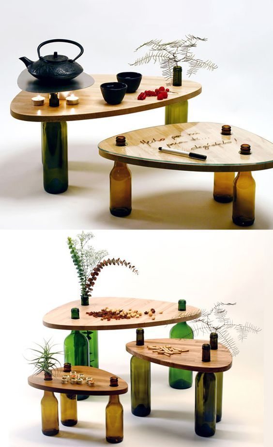 Há também os artesanatos feitos com garrafas de vinho que são funcionais, como a mesinha de centro feita com base de garrafa de vinho e tampo de madeira.