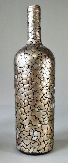 Cascas de ovos pintadas com uma tinta metalizada reveste uma garrafa de vinho com primor e ao final do trabalho nem parece que o objeto criado foi desenvolvido com elementos tão baratos.