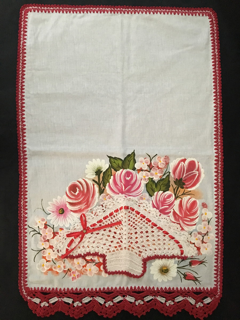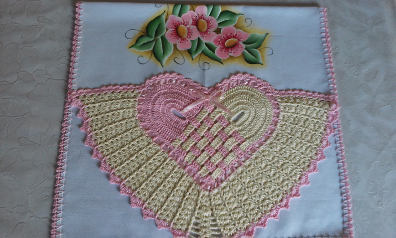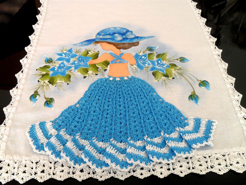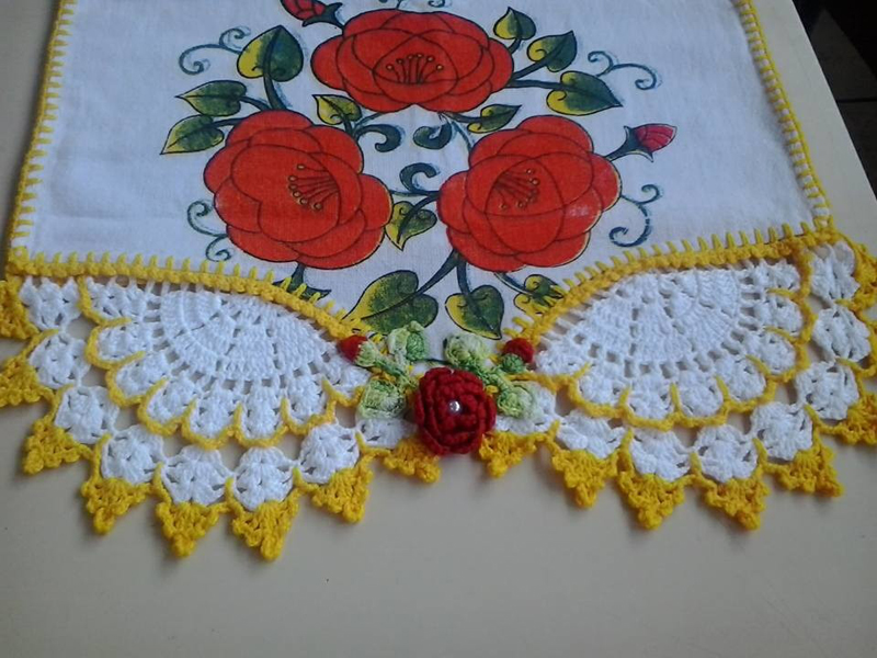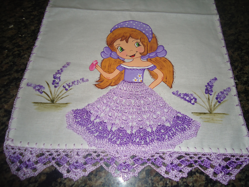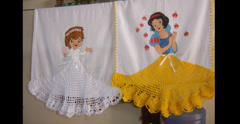 Se você sabe fazer pintura em tecido, além de saber fazer crochê, o seu pano de prato pode atingir níveis elevadíssimos de beleza e diferenciação. Pintar elementos fofos ou delicados, como bonecas, e acrescentar o crochê como detalhe, deixa o pano de prato com muito mais charme e beleza.