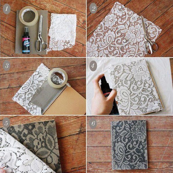 Comece separando todos os materiais que você vai utilizar em seu artesanato. Encape a capa do caderno com um pedaço de renda. Prenda com fita adesiva. Forre o local onde você vai trabalhar com a sua peça, com jornal velho, papel velho, papelão, tecido velho ou plástico. Borrife a tinta em spray sobre a renda que está no caderno. Retire a renda e está pronto!