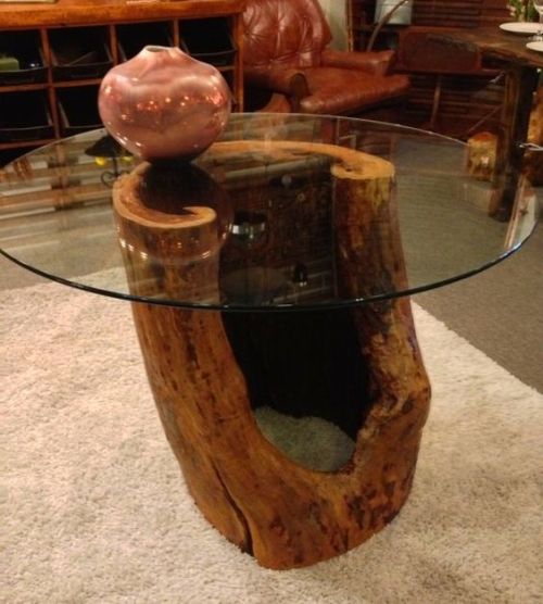 Um pedaço de tronco de árvore oco, resultado de uma árvore doente, que caiu sozinha, pode ser transformado em uma mesinha de centro ou em uma mesinha de apoio.
