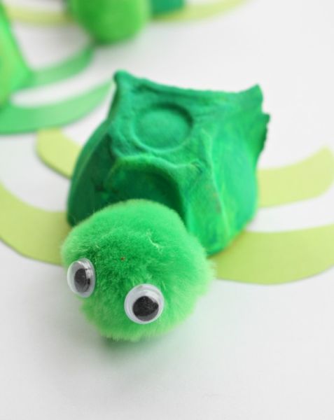 Comece separando todos os materiais que você vai utilizar em seu artesanato. Depois forre o local onde você vai trabalhar com a sua peça, com jornal velho, papel velho, papelão ou plástico. Então, corte as reentrâncias da caixa de ovos e pinte estas partes com a tinta acrílica verde. Se você quiser uma cor mais forte e intensa, aplique duas ou até mesmo três camadas de tinta, porém sempre deixando a tinta secar muito bem entre uma camada e outra. E deixe a tinta secar muito bem antes de manusear novamente a sua peça e continuar com a confecção de seu trabalho. Para finalizar a sua peça, corte no papel estruturado verde quatro patinhas para a sua tartaruga e cole-as, com o auxílio da pistola de cola quente, na parte de baixo da peça da caixa de ovos. Cole o pompom verde como a cabeça de sua tartaruga e cole os olhos escolhidos na cabeça. E está pronto!