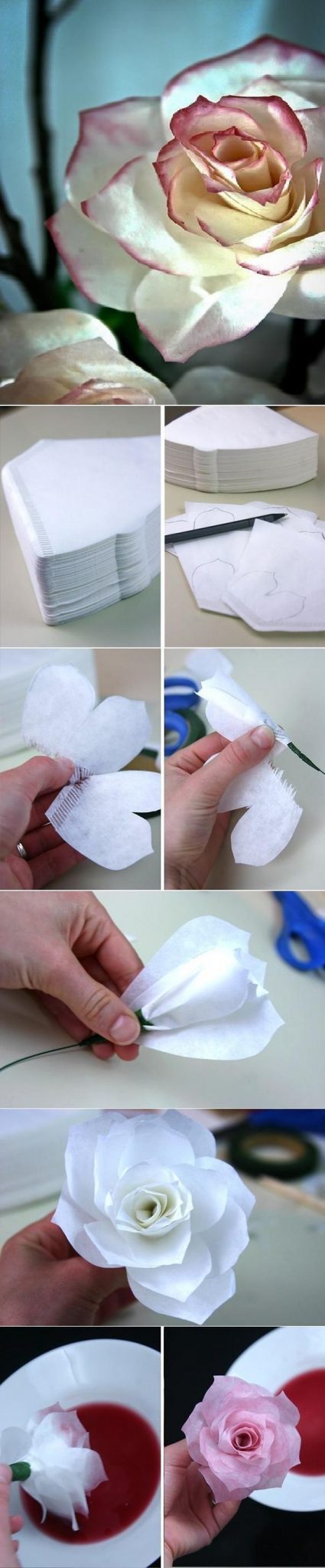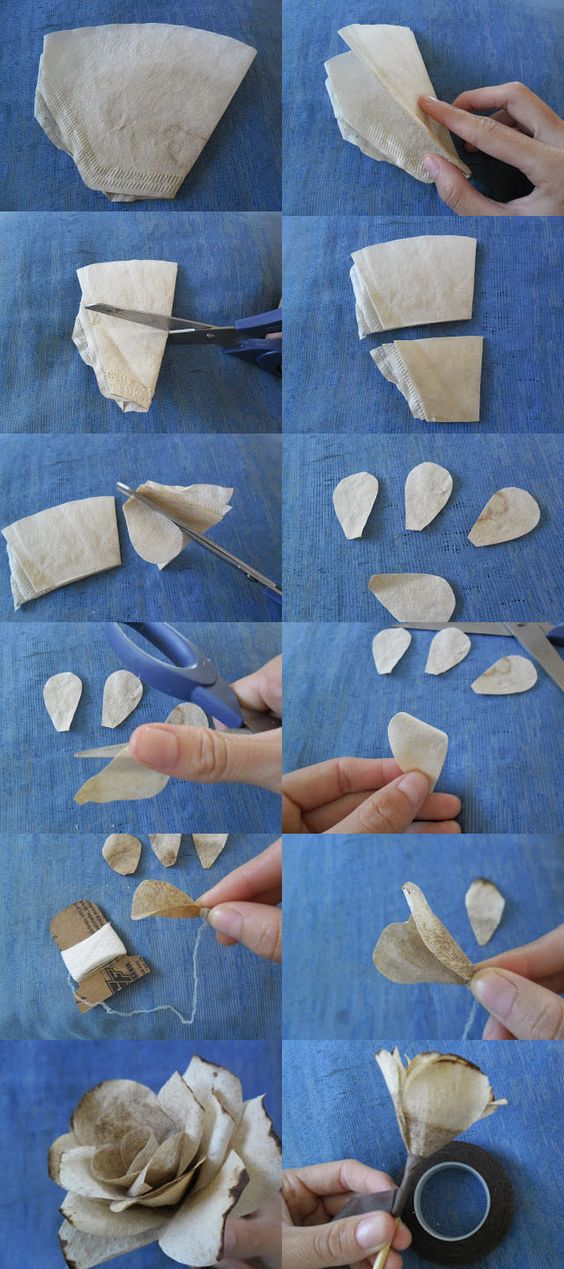 Você também pode fazer rosas com o coador de café usado, para ganhar um rosa com efeito colorido da borra de café.