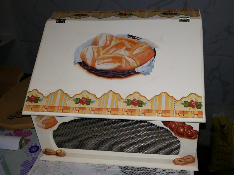 Se você vai usar uma caixa de madeira ou uma caixa de MDF para ser o seu porta pão, você pode pintar esta caixa, pode fazer decoupagem nela ou ainda forrá-la com tecido. Apliques com formatos de pães e a palavra “pão” ou “pães” também pode estar presente na tampa da caixa que será o seu porta pão.