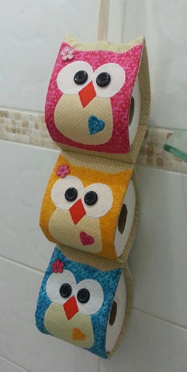 Faça uma tira de crochê com o ponto que você preferir, podendo ser apenas de ponto alto ou de ponto baixo, caso você não saiba fazer pontos elaborados de crochê. A largura da tira deve ter tamanho igual à largura do rolo de papel higiênico e comprimento que consiga acomodar dois ou três rolos de papel higiênico. Costure as pontas da tira e faça uma laçada, para pendurar. Se quiser passe bico dos dois lados com linha colorida. E costure no meio, para criar as divisórias.