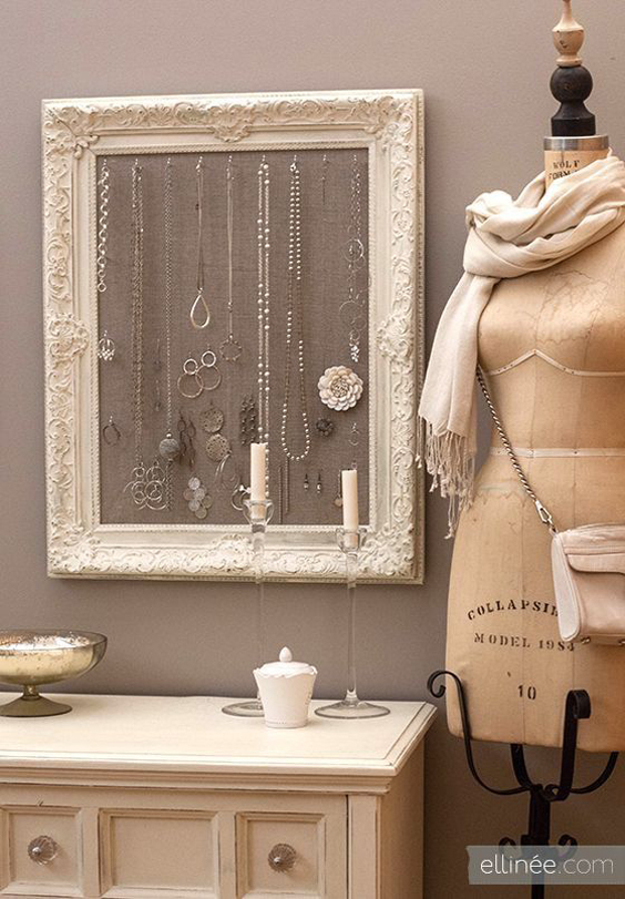 A moldura com varal para pendurar fotos ou a moldura com renda para pendurar brincos são sucessos garantidos.