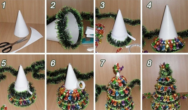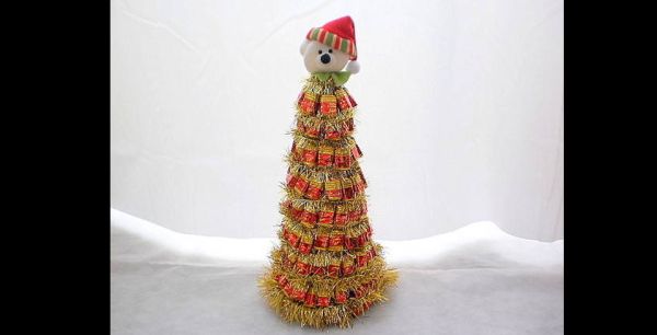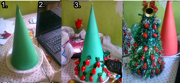 Comece separando todos os materiais que você vai utilizar em seu artesanato. Crie um cone de cartolina e prenda com grampeador. Fixe fita dupla face ao redor da base do cone e prenda o festão verde. Faça uma camada de bala, também prendendo com a fita adesiva dupla face. Vá fazendo uma camada de festão verde, uma camada de bala. Para finalizar a sua árvore de balas, Fixe balas de pé no topo da peça. E está pronto!