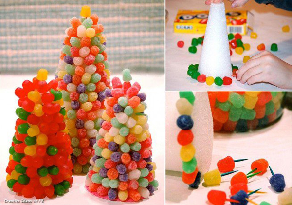 Comece separando todos os materiais que você vai utilizar em seu artesanato. Fixe pedaços de palito de dente nas gomas ou fixe nas gomas os pinos coloridos escolhidos. Para finalizar a sua peça, basta prender as gomas com pinos no cone escolhido. Aqui também você deve colocar gomas de pé no topo da árvore, para enfeitar. E está pronto!