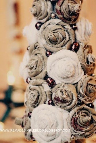 - Enrole várias tiras de tecido no formato de rosas, faça a quantidade suficiente para cobrir todo o cone.