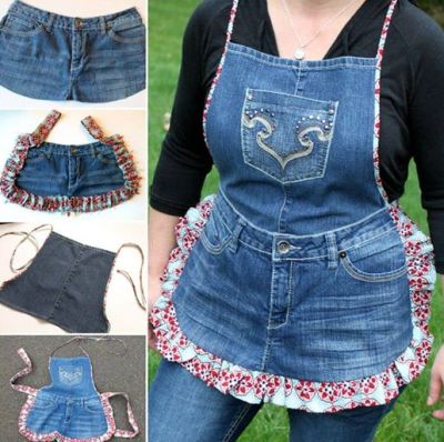 Corte a parte da frente do short jeans ou da calça jeans e se for necessário, costure a parte do cavalo de forma reta. Corte uma tira larga de tecido, dobre ao meio, com o direto para fora, franza a parte das pontas e costure ao redor da peça, deixando o cós do jeans sem babado. Costure tiras nas laterais do cós, para amarar na cintura. Com a parte detrás do short ou de uma perna da calça, faça a parte superior do avental, costurando tiras de tecido nas laterais, e deixando sobra, para amarrar no pescoço. Decore o seu avental com o bolso da calça ou do short. E está pronto!