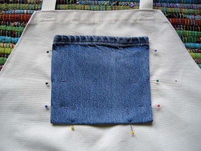 Corte um pedaço da perna da calça jeans ou um quadrado de tecido, passe a ferro as laterais e prenda no avental, para ser um bolso.