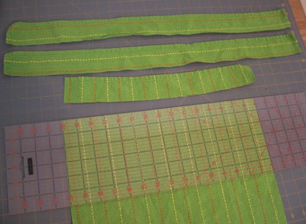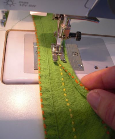 Agora, faça uma bainha à máquina ao redor de todo o avental. Porém você deve fazer a bainha das cavas, decote e laterais voltadas para um lado do tecido; já a bainha da barra do avental deve ficar voltada para o outro lado escolhido, para você poder criar as divisórias para os lápis.