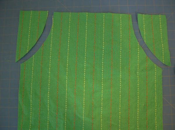 Logo após, corte os cantos superiores do tecido, formando as cavas do avental, para que seu pequeno não tenha os movimentos tolhidos por causa da falta de cavas.