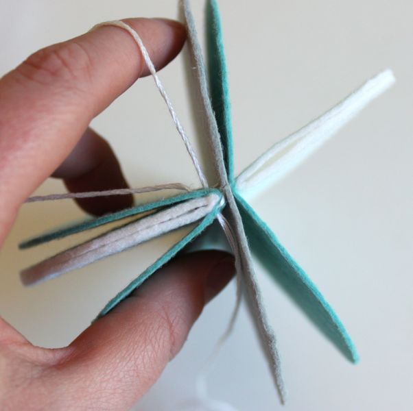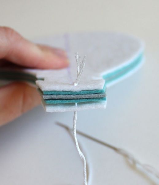 Agora, passe as linhas de bordado pela agulha de bordado, faça um nó na ponta e passe a agulha com a linha pela base da sua pilha de balões.