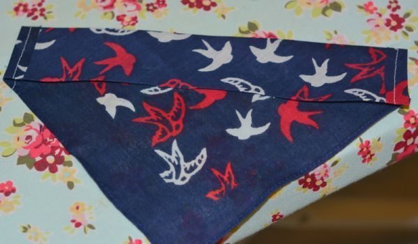 Logo após, para finalizar a sua peça, passe uma costura reta na parte reta, para formar a barra. Mas não costure as laterais, pois será pelas laterais que você vai passar a coleria do seu cachorrinho. Passe a coleria pela barra da bandana. E está pronto!