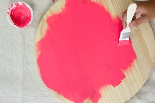 Em seguida, forre o local onde você vai pintar a sua peça, com jornal velho, papel velho, papelão ou plástico. E comece a pintar o seu círculo de madeira, com a tinta com a cor vermelha.