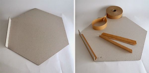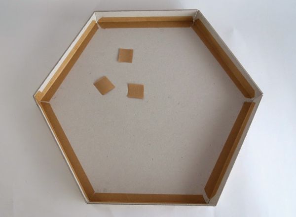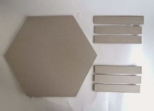 Comece cortando um hexágono com tamanho que você queira para a sua bandeja. Depois corte seis tirinhas de papelão com o mesmo comprimento do lado do hexágono e largura de sua preferência.
