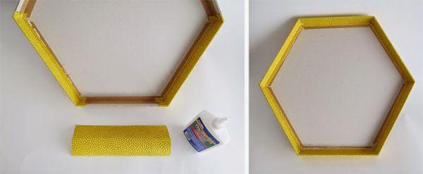 Em seguida, comece a colar as tirinhas nas laterais do hexágono, colando primeiramente com a cola branca comum e depois com o auxílio de pedaços de fita adesiva de sua preferência.