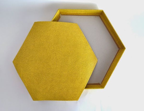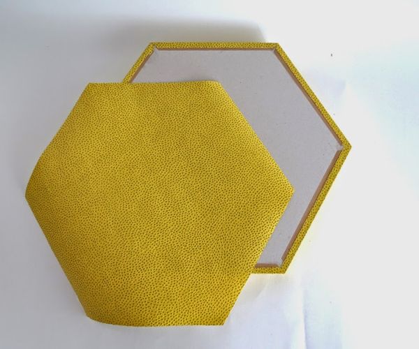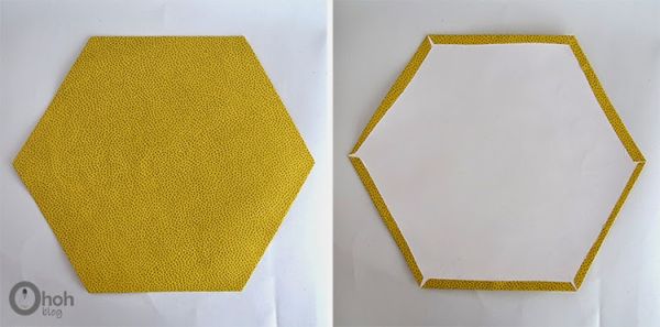 Logo após, corte um hexágono no papel escolhido com o tamanho um pouco maior que o tamanho do fundo da sua bandeja.