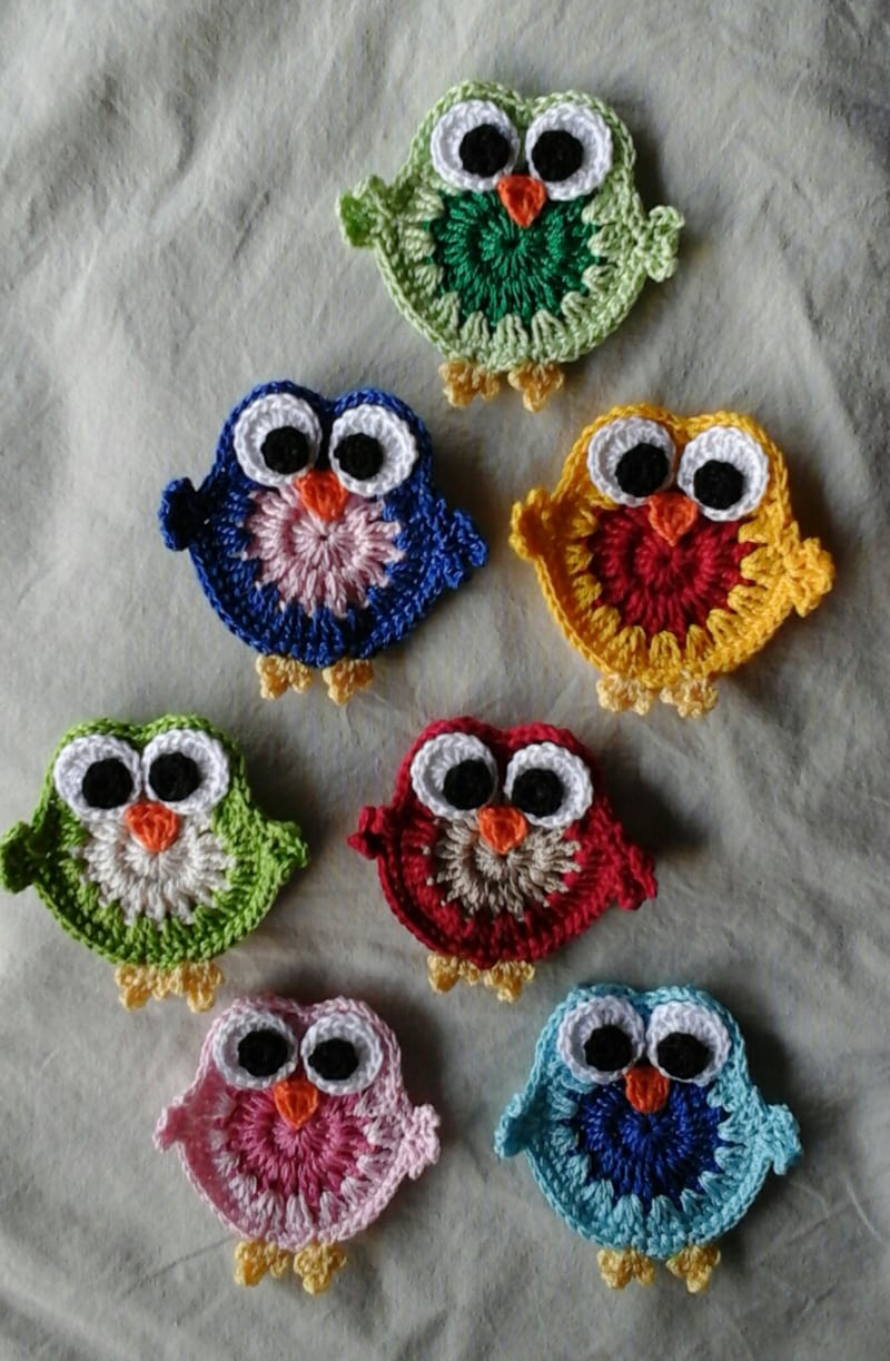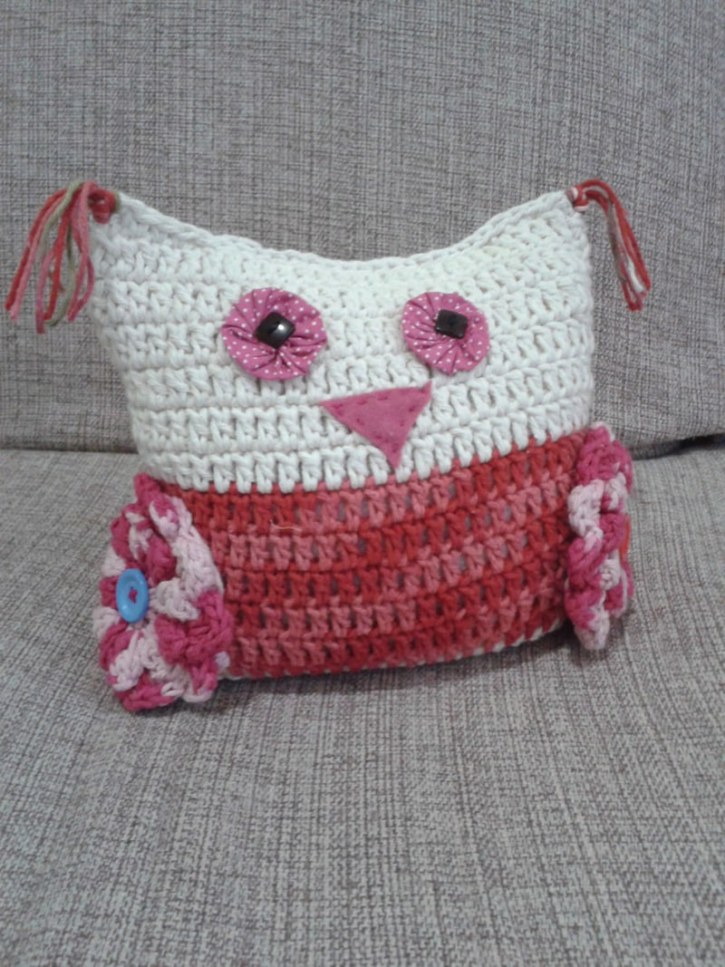 Os bichinhos de crochê peso de porta podem ser bem fáceis de serem feitos, como a coruja de crochê, que é feita com 2 quadrados de crochê costurados juntos e com detalhes de fuxico de tecido.